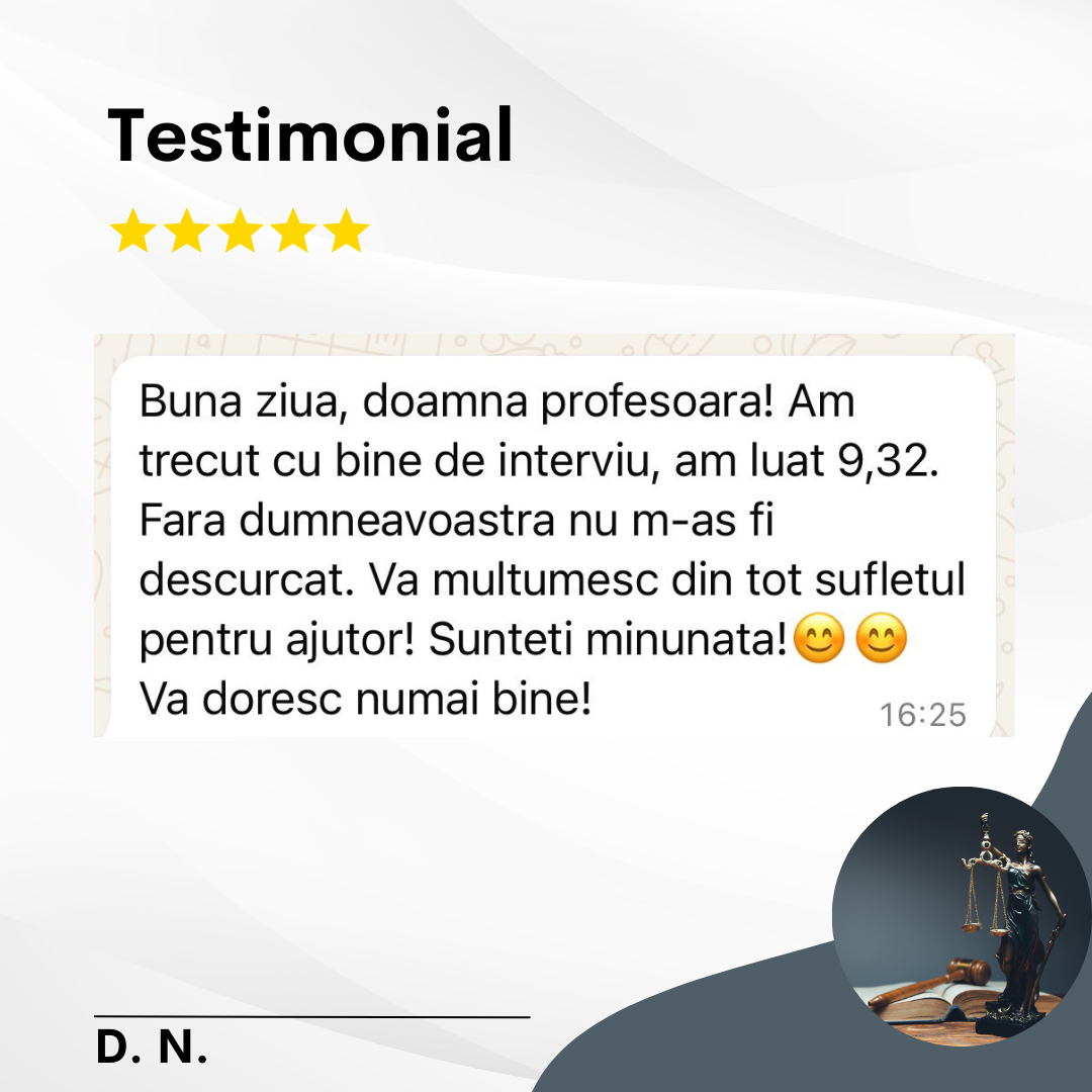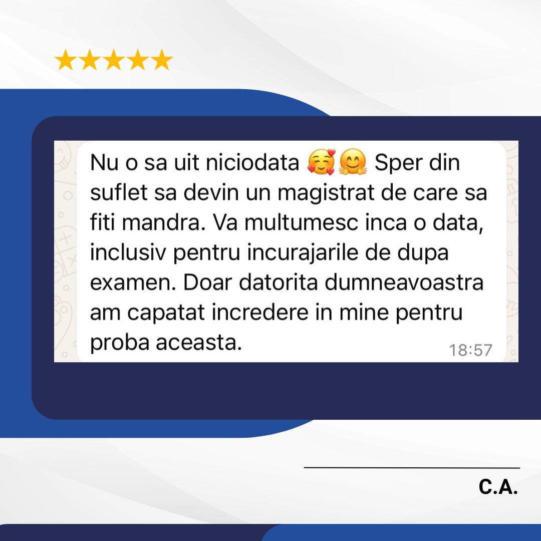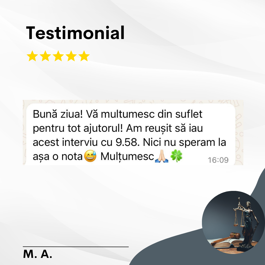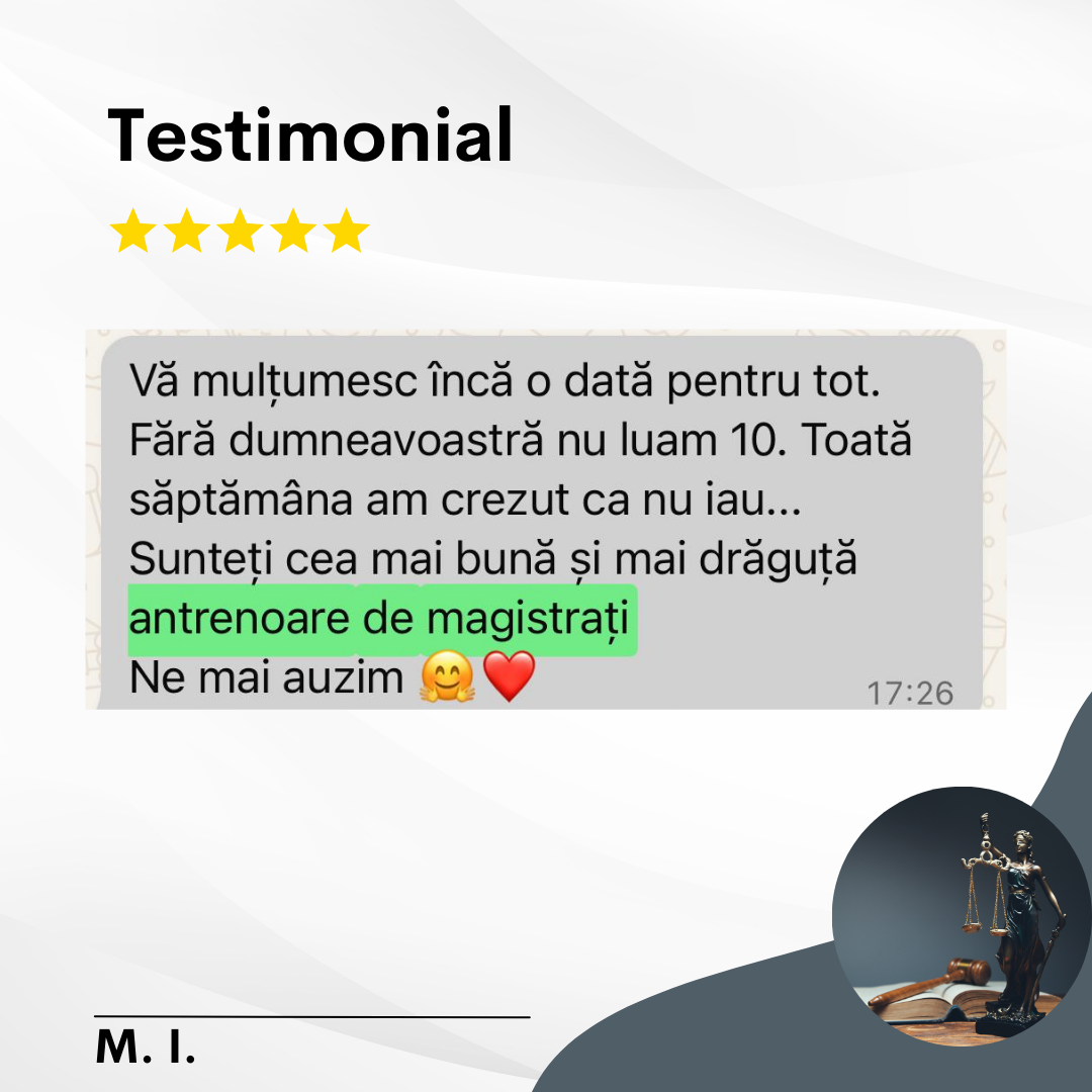 Am luat interviul cu nota 9. Vreau să vă mulțumesc din suflet pentru sprijinul acordat și să vă spun că pentru mine sunteți un om deosebit, un adevărat antrenor de magistrați. M.ați ajutat să învăț să gândesc și să văd această profesie că pe un stil de viață. Fără dumneavoastră nu aș fi reușit ❤️ Vă sunt profund recunoscătoare și vă mulțumesc pentru tot! ❤️❤️❤️ (M.I.)