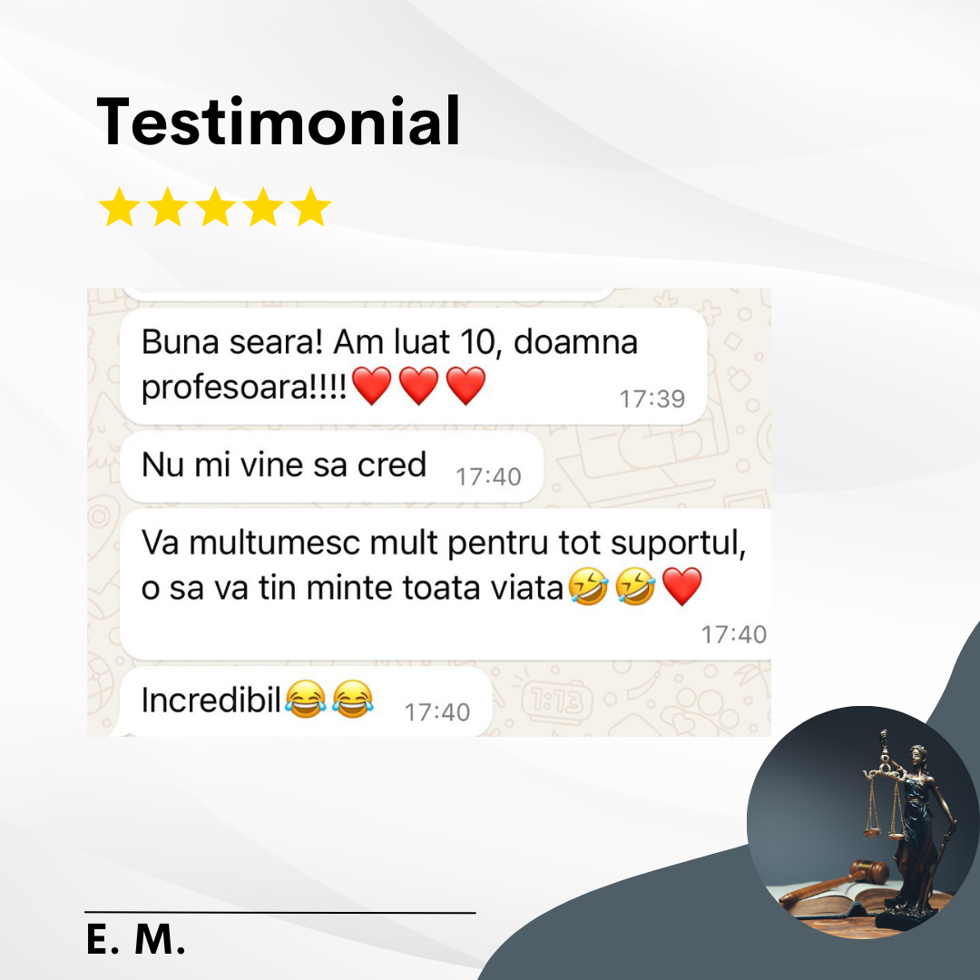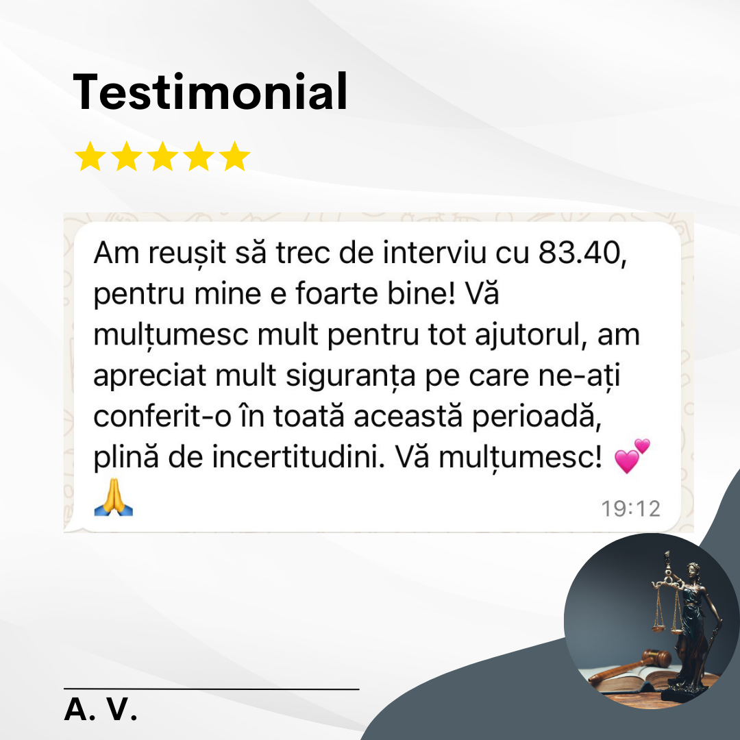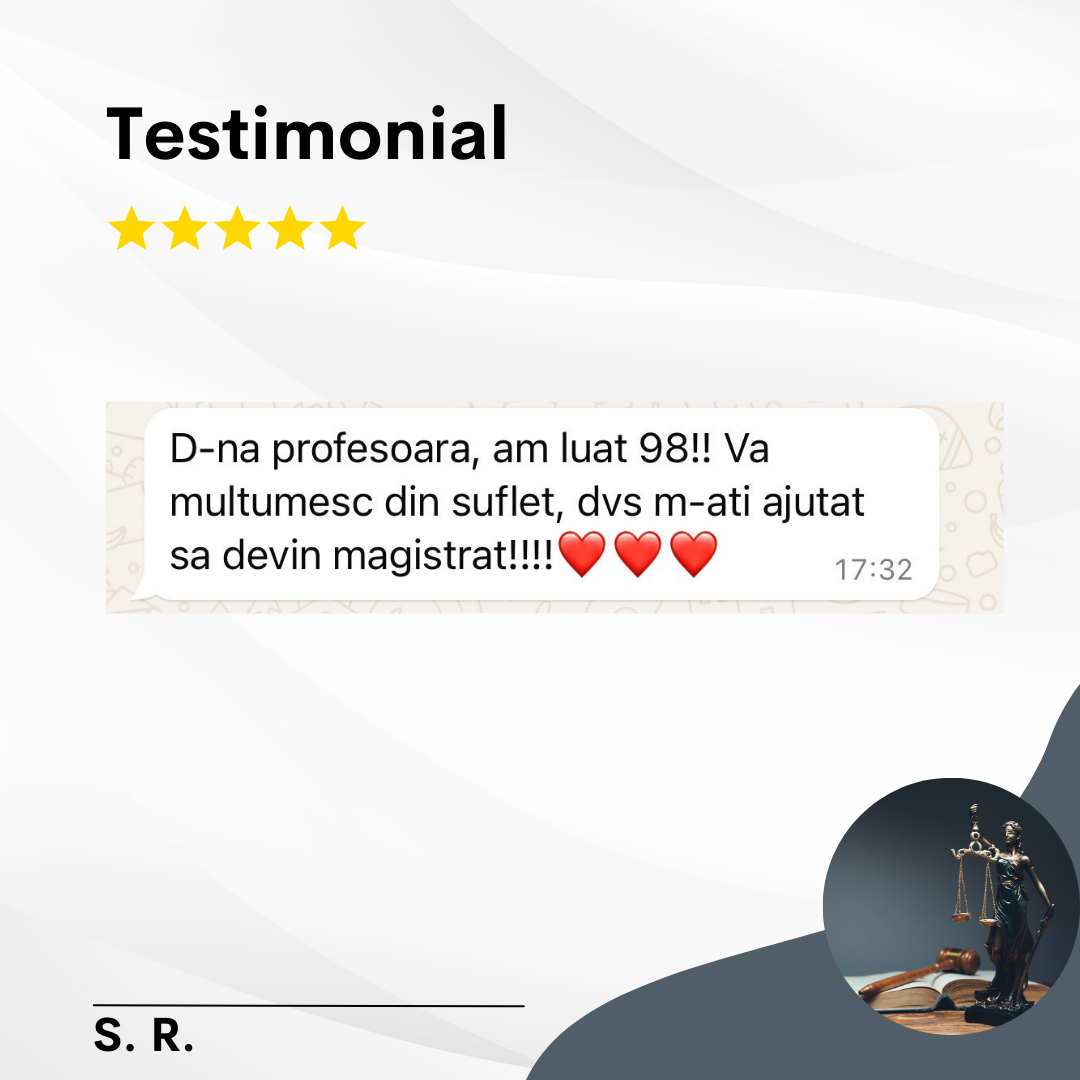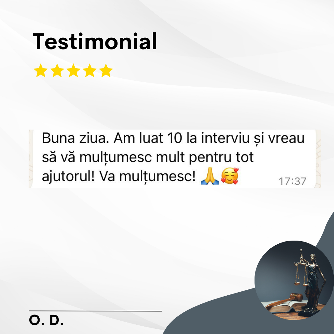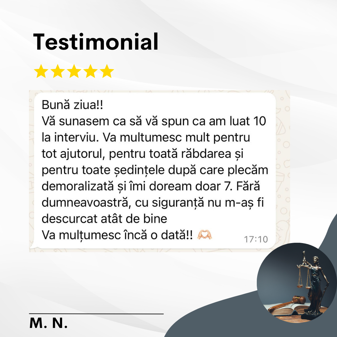 Am luat interviul cu nota 9. Vreau să vă mulțumesc din suflet pentru sprijinul acordat și să vă spun că pentru mine sunteți un om deosebit, un adevărat antrenor de magistrați. M.ați ajutat să învăț să gândesc și să văd această profesie că pe un stil de viață. Fără dumneavoastră nu aș fi reușit ❤️ Vă sunt profund recunoscătoare și vă mulțumesc pentru tot! ❤️❤️❤️ (M.I.)