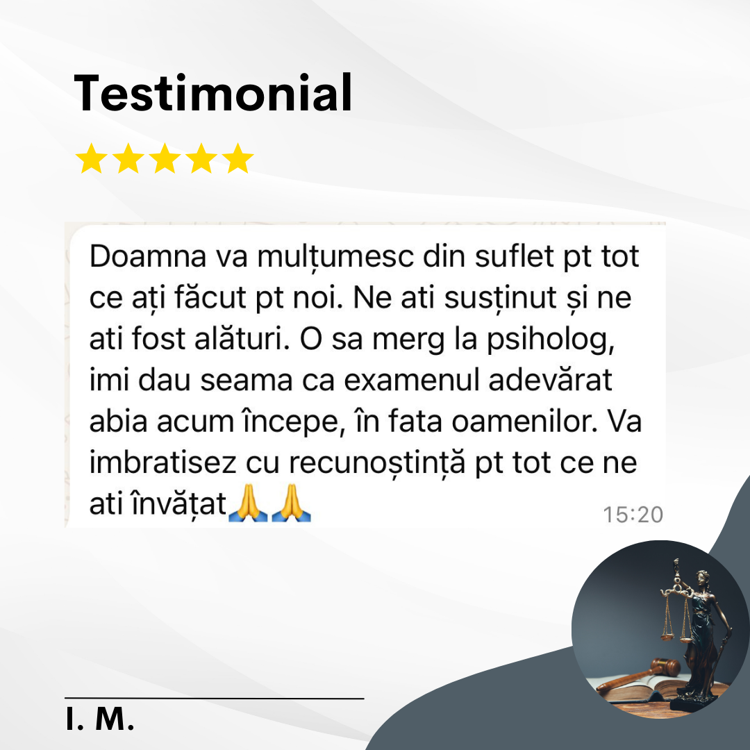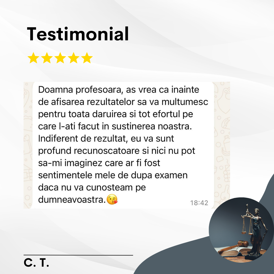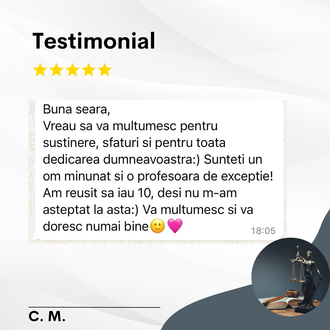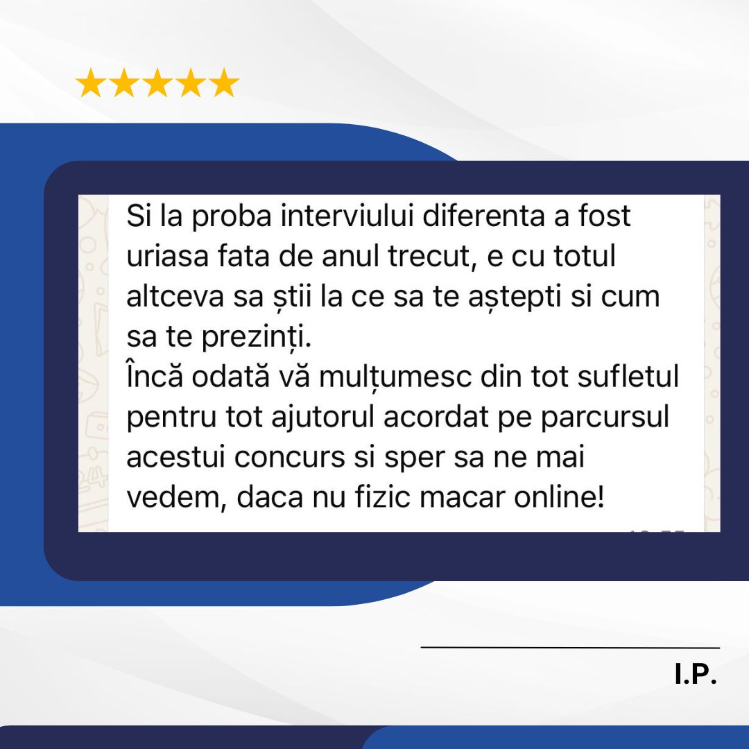 Am luat interviul cu nota 9. Vreau să vă mulțumesc din suflet pentru sprijinul acordat și să vă spun că pentru mine sunteți un om deosebit, un adevărat antrenor de magistrați. M.ați ajutat să învăț să gândesc și să văd această profesie că pe un stil de viață. Fără dumneavoastră nu aș fi reușit ❤️ Vă sunt profund recunoscătoare și vă mulțumesc pentru tot! ❤️❤️❤️ (M.I.)
