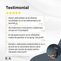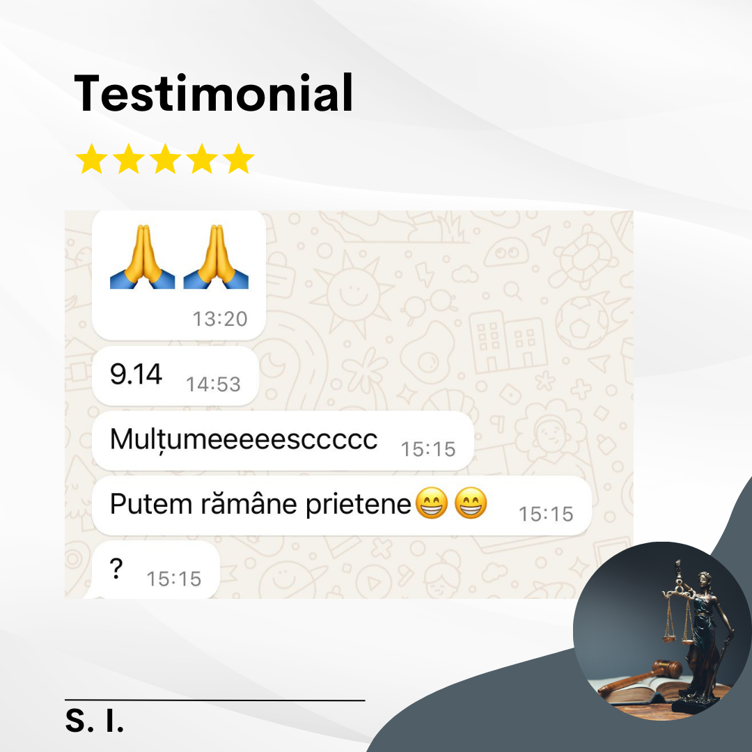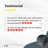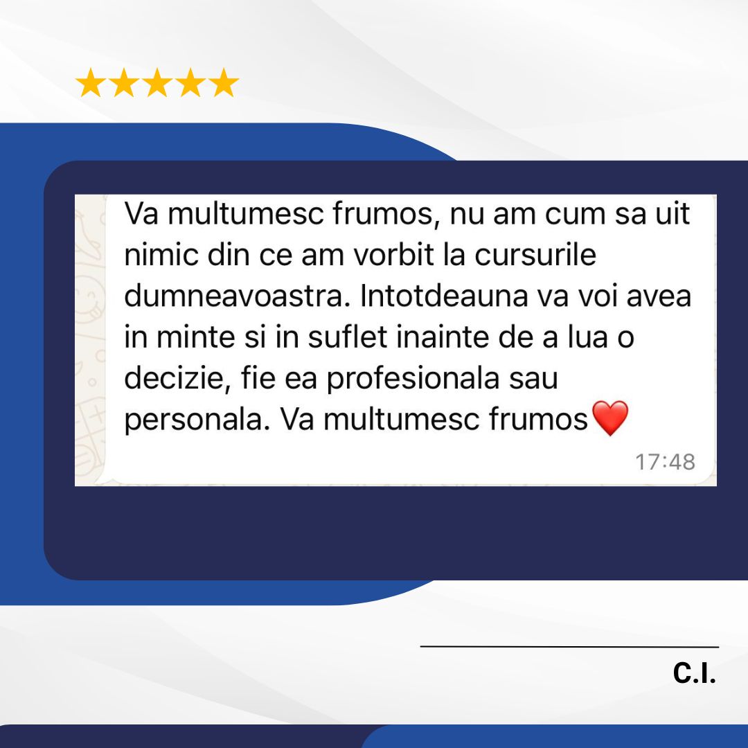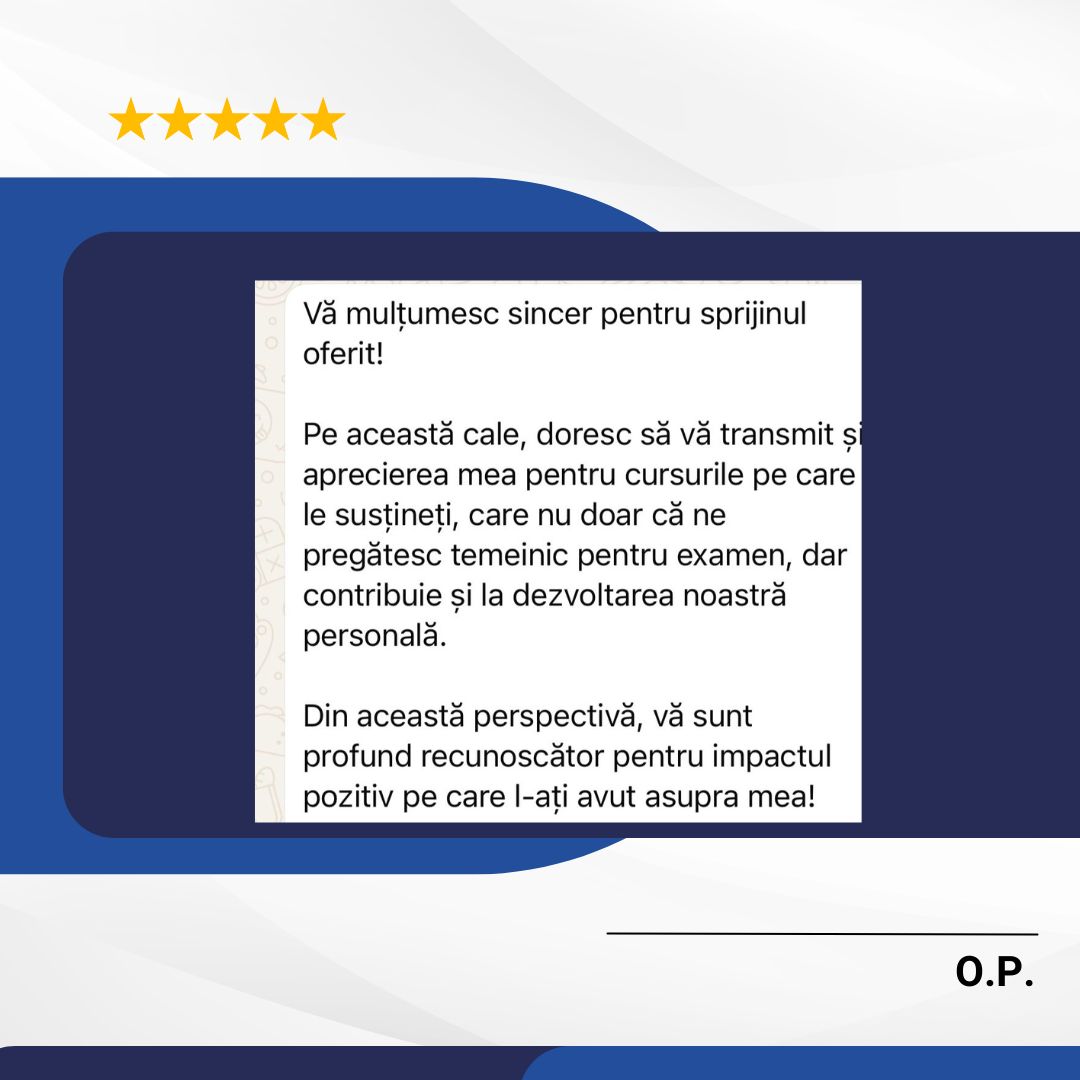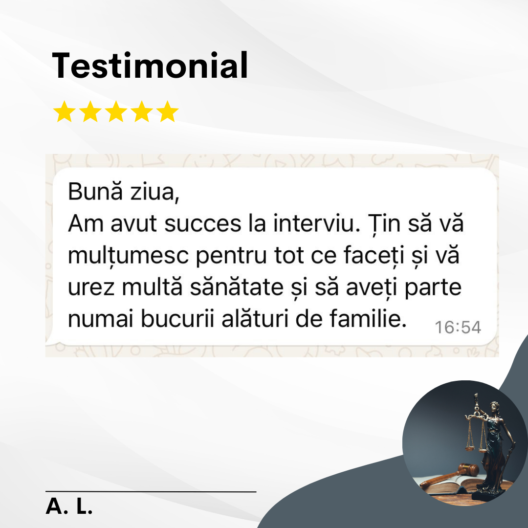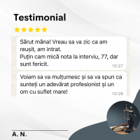 Am luat interviul cu nota 9. Vreau să vă mulțumesc din suflet pentru sprijinul acordat și să vă spun că pentru mine sunteți un om deosebit, un adevărat antrenor de magistrați. M.ați ajutat să învăț să gândesc și să văd această profesie că pe un stil de viață. Fără dumneavoastră nu aș fi reușit ❤️ Vă sunt profund recunoscătoare și vă mulțumesc pentru tot! ❤️❤️❤️ (M.I.)