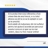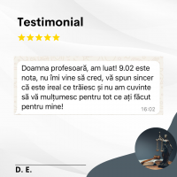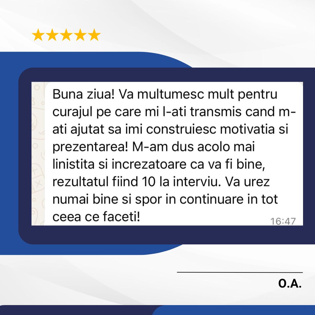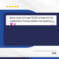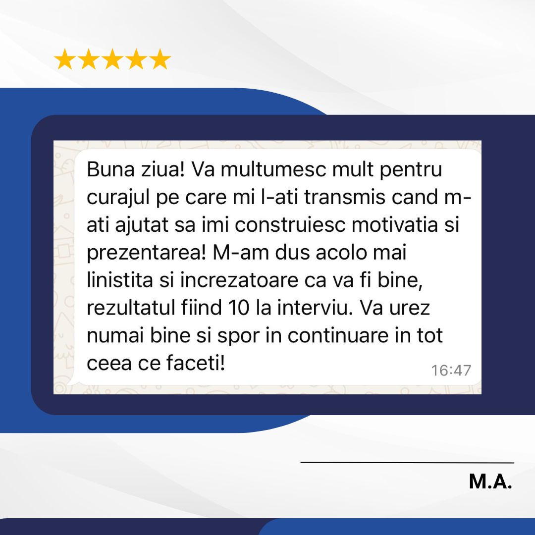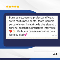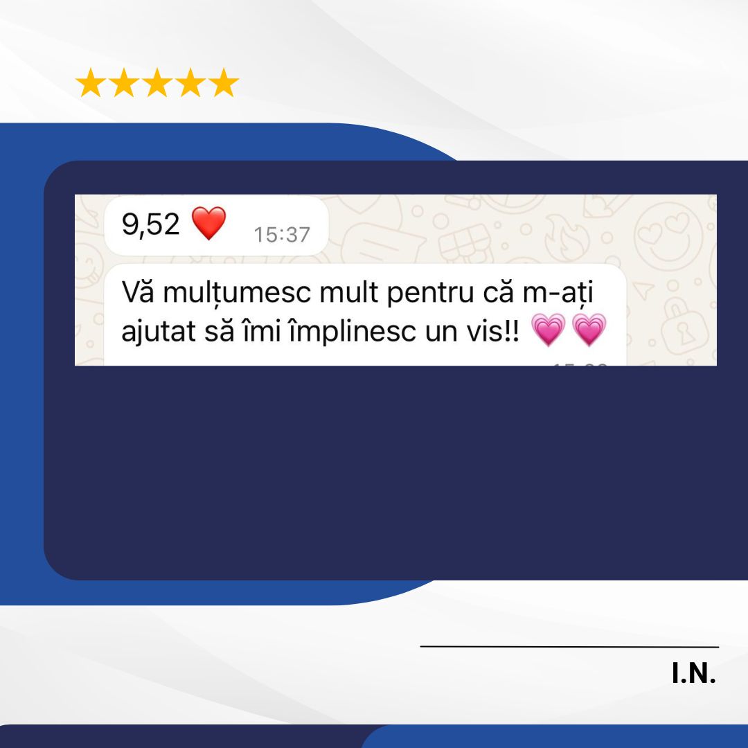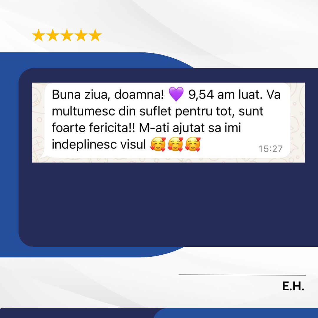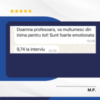 Doamna, nici nu stiu cum sa va multumesc pentru tot! Am luat 9 la interviu. Stiu unde am gresit, dar tot ce conteaza e ca sunt admisa. Pentru mine a fost o placere sa va cunosc si sa ma pregatesc alaturi de dumneavoastra. Sunteti deosebita! Va imbratisez strans! ❤️❤️❤️ (I.T.)