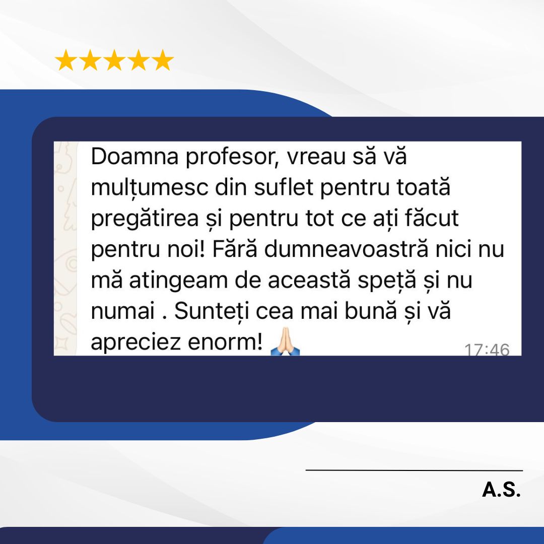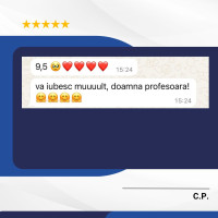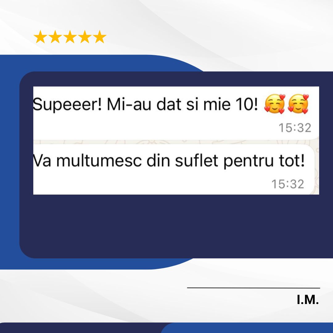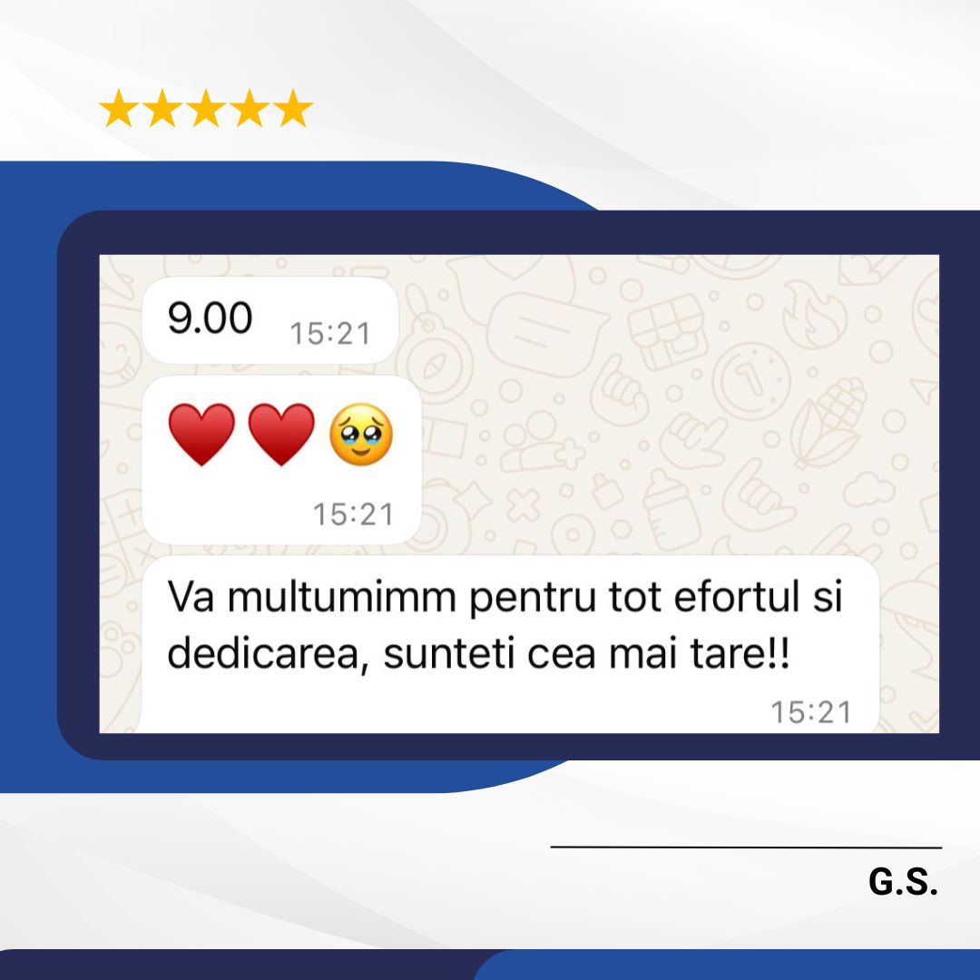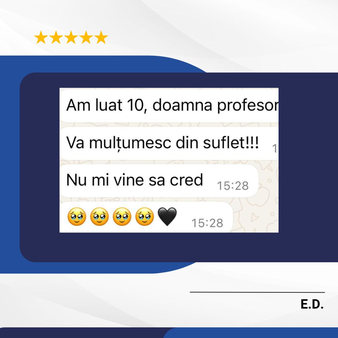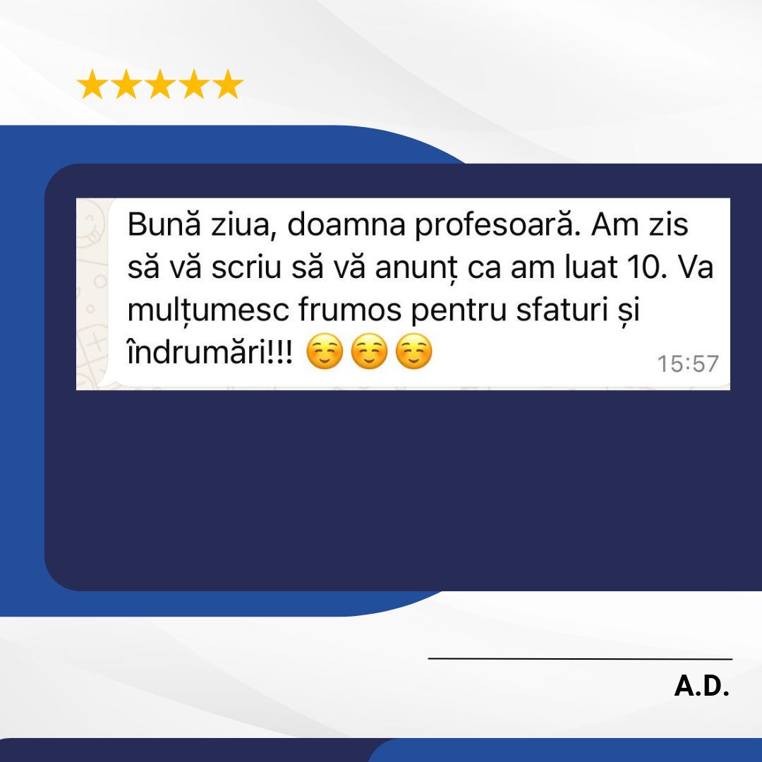 Buna ziua, doamna! Am luaaat! Va multumesc mult pentru toate sfaturile si pentru tot ajutorul! Fara dumneavoastra nu puteam sa iau nici nota 1! Va multumesc din suflet pentru tot❤️❤️❤️❤️ (A.R.)