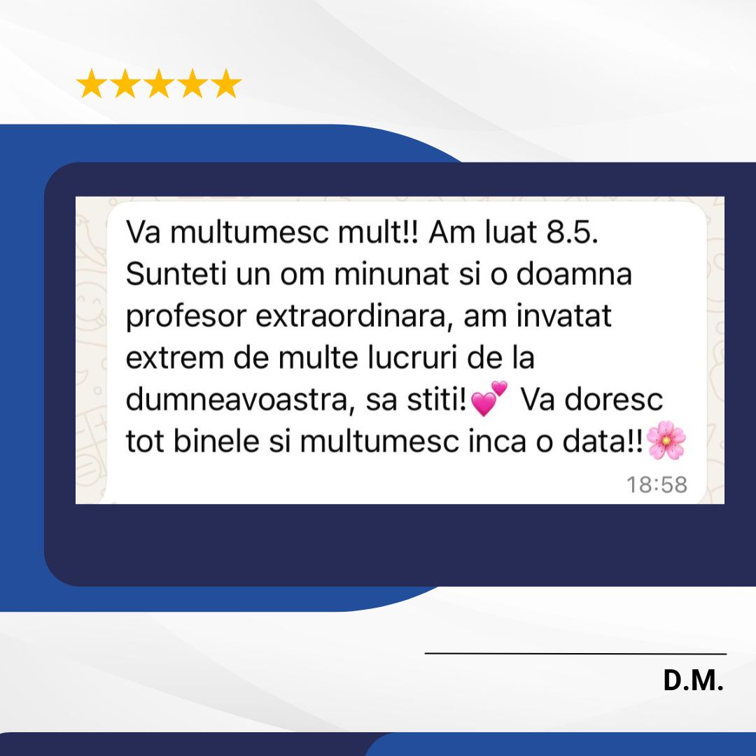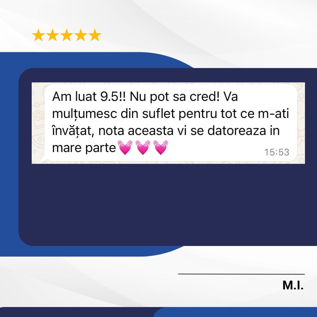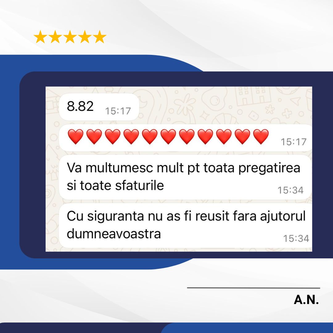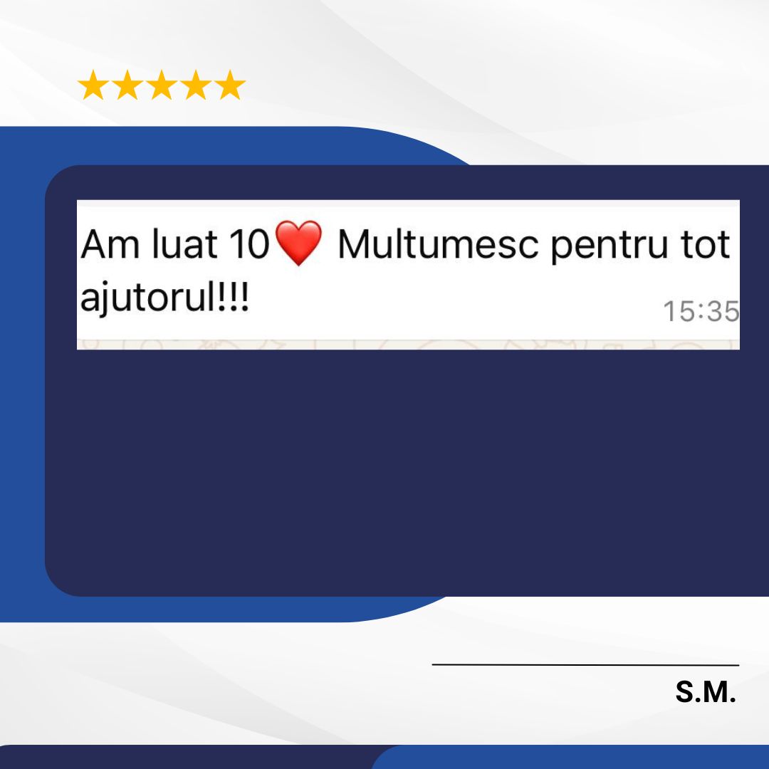 Buna ziua, doamna! Am luaaat! Va multumesc mult pentru toate sfaturile si pentru tot ajutorul! Fara dumneavoastra nu puteam sa iau nici nota 1! Va multumesc din suflet pentru tot❤️❤️❤️❤️ (A.R.)