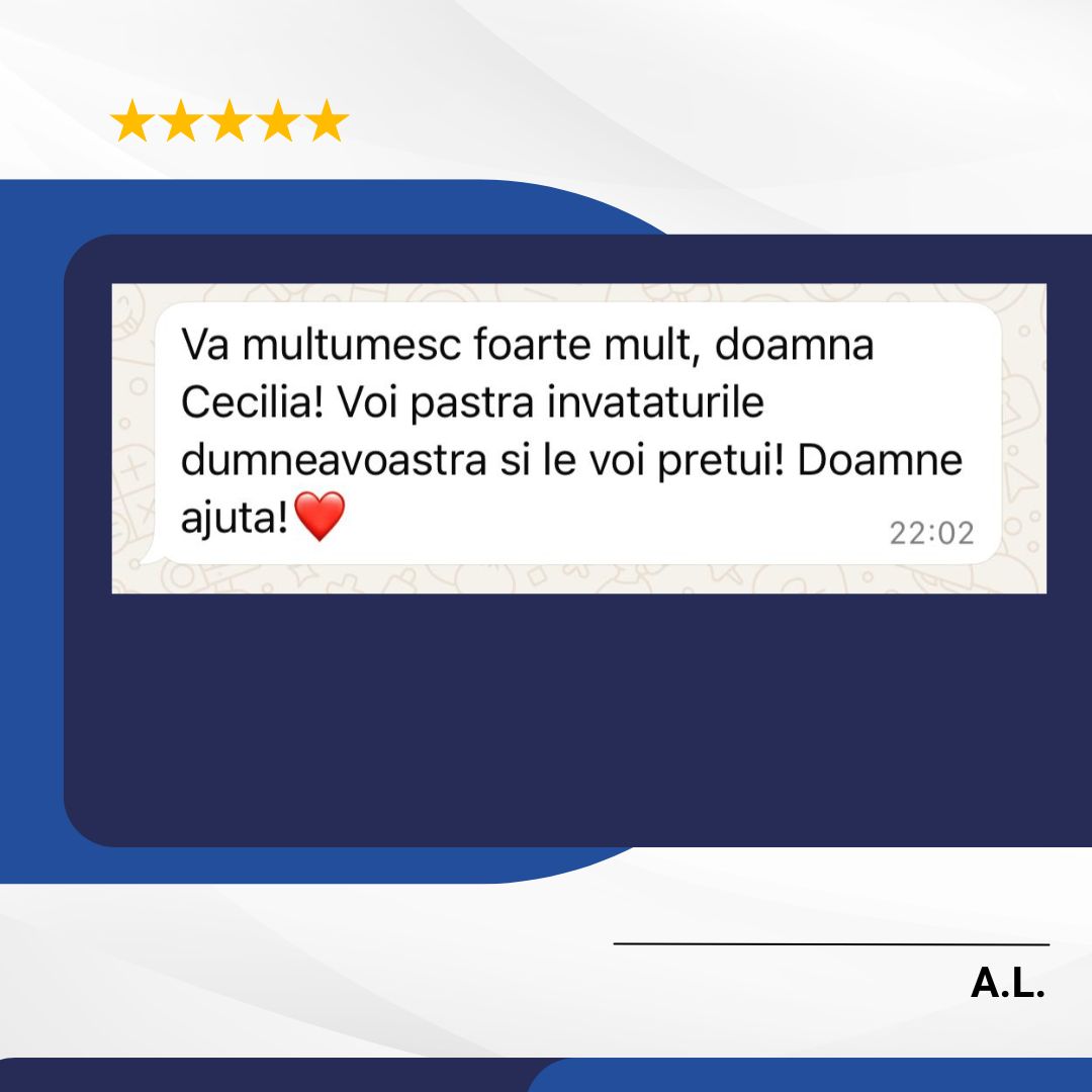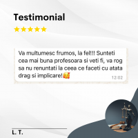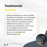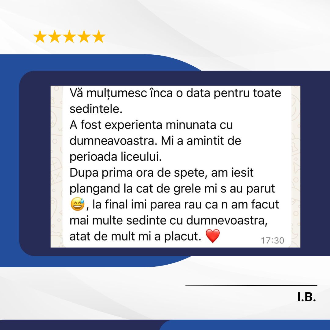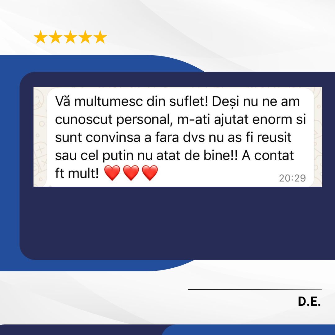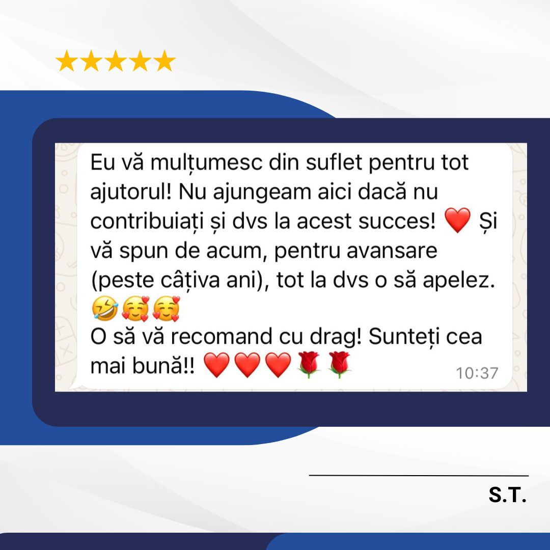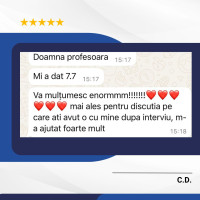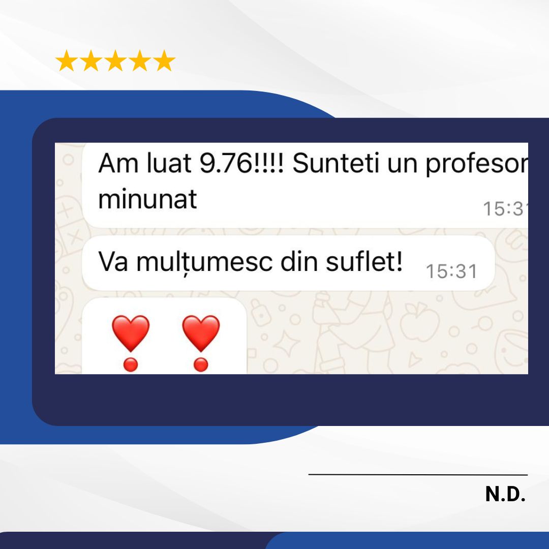 Buna ziua, doamna! Am luaaat! Va multumesc mult pentru toate sfaturile si pentru tot ajutorul! Fara dumneavoastra nu puteam sa iau nici nota 1! Va multumesc din suflet pentru tot❤️❤️❤️❤️ (A.R.)