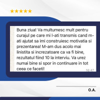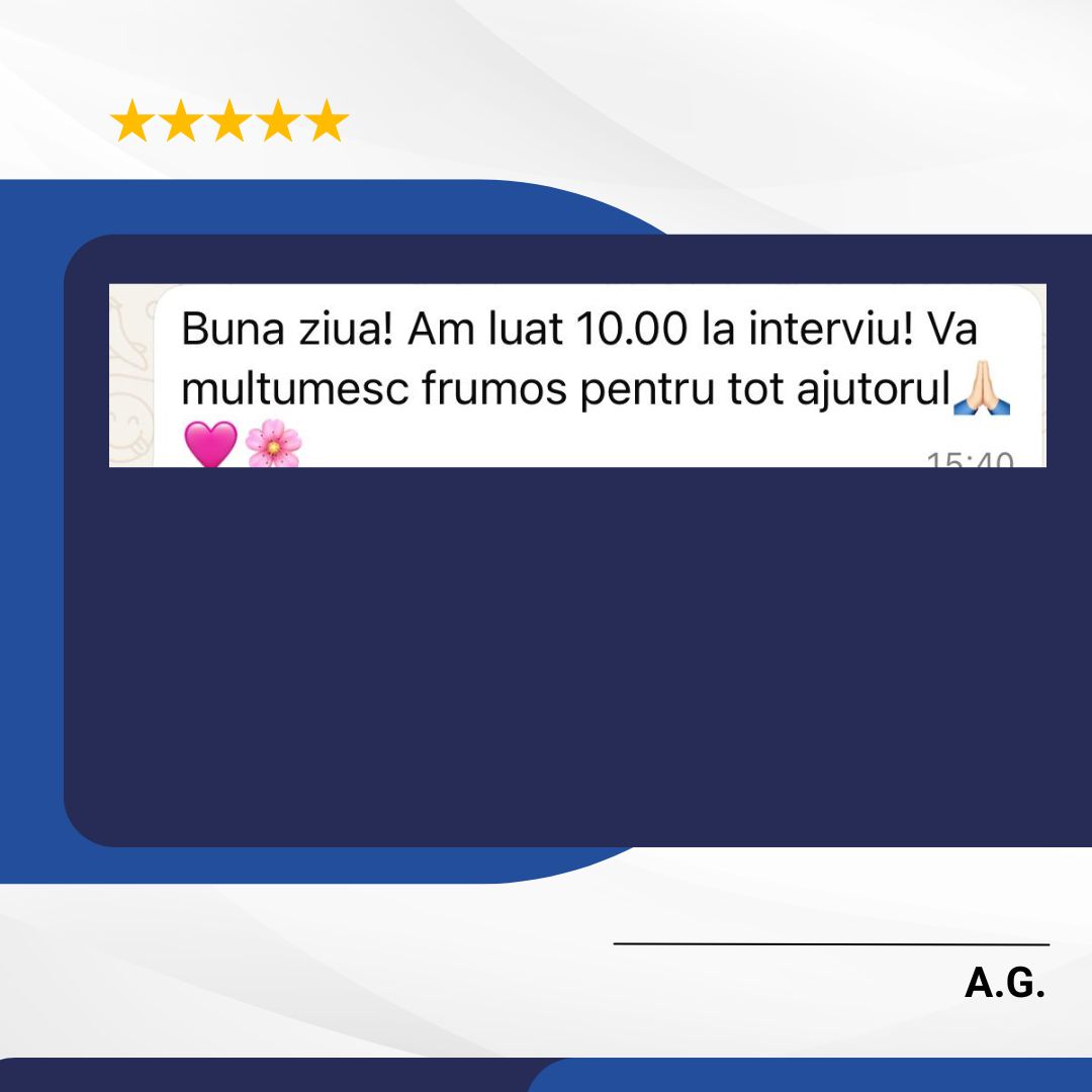 Bună seara, doamna Cecilia! Voiam să vă spun că după simulare m-am dus la interviu cu toată încrederea că va fi bine. Am zis că dacă am făcut față la dumneavoastră, care sunteți dură ❤️ Într-un sens bun, bineînțeles, O să fac și în fața comisiei. O seara frumoasa va doresc! Multumesc! (C.P.)
